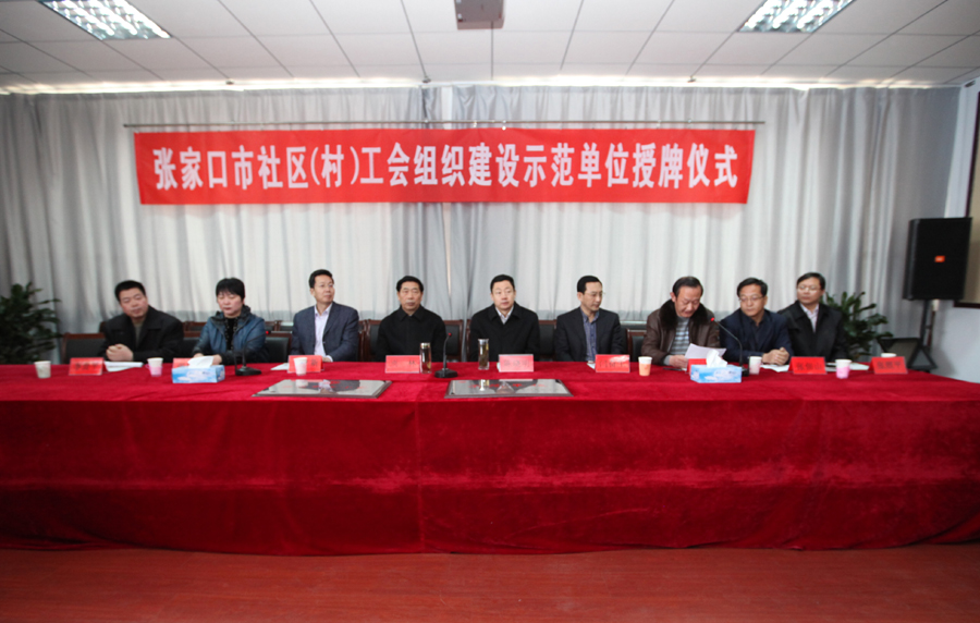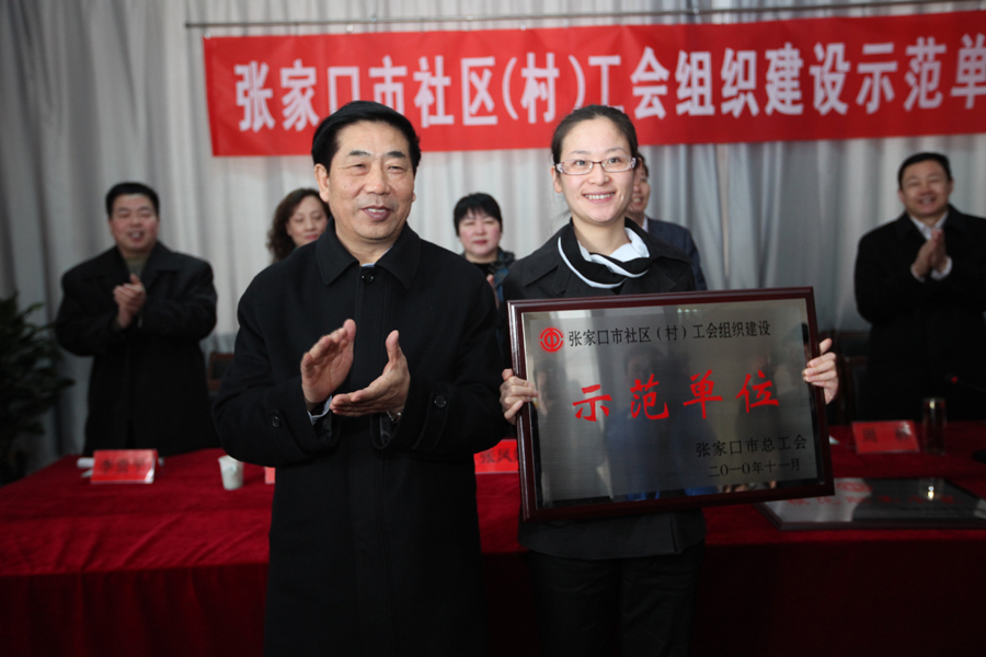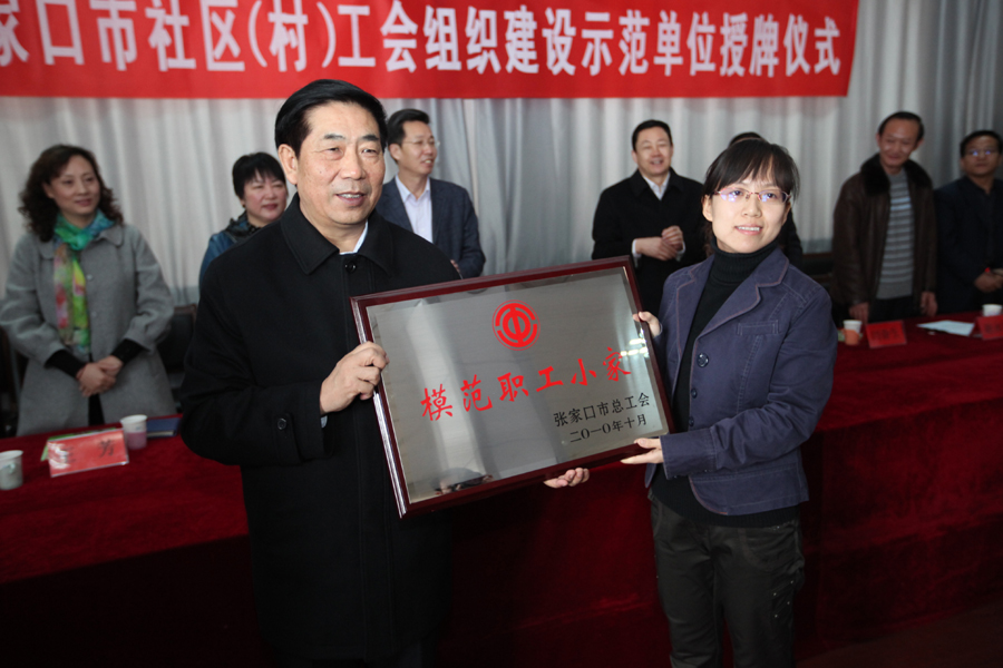 桥西工会服务中心揭牌仪式后,周林主席为工人新村街道办事处南新村社区授牌“张家口市社区(村)工会组织建设示范单位”和“张家口市模范职工小家”。这是全市首家社区(村)工会组织建设示范单位,社区党总支书记、工会主席李敬向市区领导汇报了南新村社区规范化建设的情况,市总工会党组书记、常务副主席朱立新对我区工会工作进行了肯定和赞扬,对今后工作提出具体要求,寄予了更大的期望,区委常委张佃山代表区委做了表态发言。