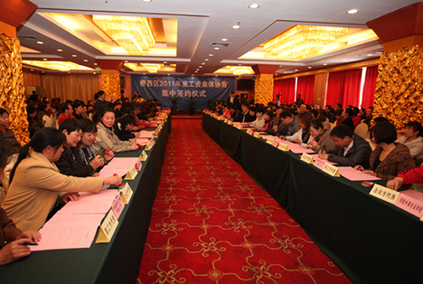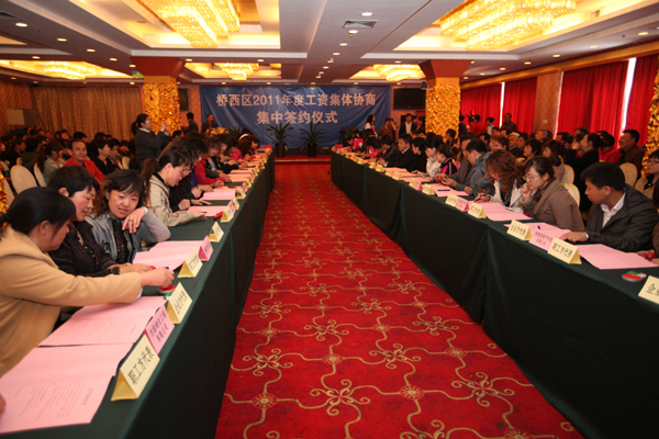 开展工资集体协商,是建立职工工资决定机制和调整机制的重要内容,是协调稳定劳动关系,实现“职企共赢”,促进经济发展和社会稳定的有效途径,已被桥西区委纳入年终部门考核的重要指标之一,成为保民生、促和谐的重要桥梁和手段。桥西区总工会组织百家企业集中签约,用规模扩大影响,用实效推动工作,有效促使企业全面建立工资集体协商机制。