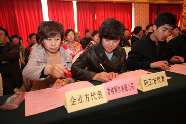 4月27日上午,金凤大厦大厅内喜气洋洋。桥西区总工会组织130家重点企业举行工资集体协商集中签约仪式。参加本次活动的是桥西区机械、商贸、餐饮等行业性企业,经过区总工会近一个月的要约,反复商议,企业方代表和职工方代表当场签定工资集体合同,就工资增长幅度达成共识。本次集中签约,工资年度增长5%——15%的企业有80家;工资年度增长15%---20%的企业有 11家;工资年度增长20%以上的企业有37家;工资年度增长40%的企业有2家。