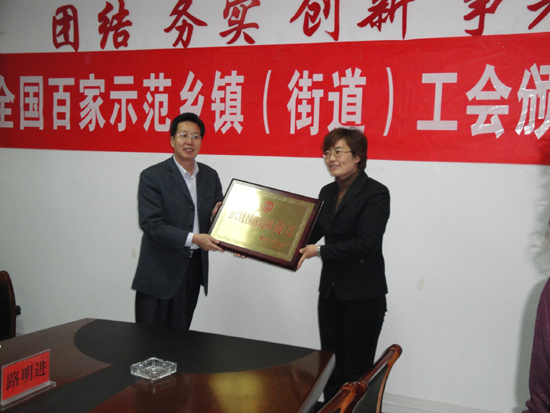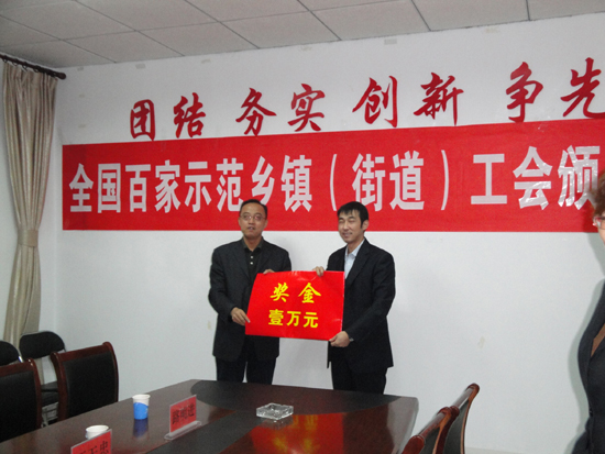 11月29日下午,市总工会党组书记、副主席朱立新、区委副书记汪天忠和区人大副主任、总工会主席李贵平、常务副主席路明进,为明德北街道总工会送去了全国总工会颁发的 全国百家示范乡镇(街道)工会称号的奖牌,同时,区总工会给予明德北街道总工会10000元奖金奖励,以充分调动基层工会组织创先争优的积极性,努力营造各个学先进,人人赶先进的良好氛围。