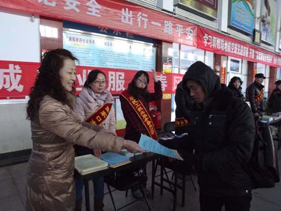 23上午,桥西区总工会与区人力资源与社会保障局、区妇联在西沙河长途汽车站开展了2012年“春风行动”,对返乡农民工及在外务工人员进行了农民工维权宣传及用工介绍等服务,以满足大量农民工进城务工的需求。(陈大伟)