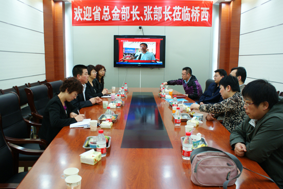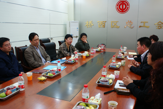 4月24日,省总工会组建部部长金树生、副部长王勇在市总工会副主席张凤娥、组建部长凌蓬及班子成员一行5人,到桥西区对工会开展“双亮”(暨工会组织亮牌子示职责、工会干部亮身份许承诺)活动情况进行调研。