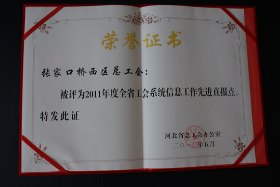 在刚刚结束的省总工会系统信息工作会上,桥西区总工会被评为“2011年度全省工会系统信息工作先进直报点”,并授予荣誉证书,成为2011年度全省工会系统先进直报点中,张家口市唯一一个获此殊荣并进入前三名的单位。(张春燕)