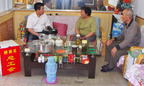 近日,为了庆祝中国共产党成立91周年。桥西区人大副主任、区总工会主席李贵平带领区总工会部分干部深入到老劳模、老党员的家中进行走访慰问并带去慰问品。老劳模、老党员们对区总工会领导的关心表示衷心感谢。(白海燕)