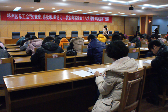 为营造深入学习贯彻党的十八大精神的浓厚氛围,帮助广大职工群众进一步了解党领导人民建立新中国、建设社会主义、开创中国特色社会主义新局面的伟大历程和辉煌成就,坚定走中国特色社会主义道路的信心和信念。把广大职工群众的思想统一到党的十八大精神上来,推进社会主义核心价值体系建设,激发爱岗敬业工作热情,在全区建设的进程中发挥出工人阶级的主力军作用。12月6日,桥西区总工会在区直机关大楼举办了“知党史、感党恩、跟党走——桥西区职工贯彻落实党的十八大精神知识竞赛预赛”。