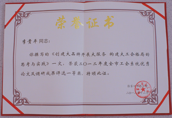 元月9日,在市总工会系统调查研究及理论创新工作总结会上,桥西区总工会被评为“调查研究及理论创新工作”优胜单位。区人大副主任、区总工会李贵平主席撰写的《创建大品牌,开展大服务,构建大工会格局的思考与实践》被评为全市工会系统优秀论文及调研成果评选一等奖。李主席同时代表桥西区就如何做好信息调研工作,向与会领导同志做了经验交流。(张春燕图张辰)