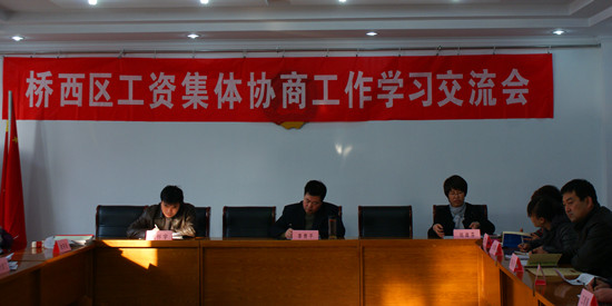 2013110下午,在政府二楼会议室召开了,桥西区2012年工资集体协商工作学习交流会。参加会议的是纳入党政考核的七街一镇、工信局、商务局、教育局、武城街管委会、的常务副主席和专职工会干部。工资集体协商工作典型企业帝达集团公司、远大工程集团公司、斯必克冷却技术(张家口)有限公司的工会主席,区总工会及人社局、商会负责人共计30余人。
