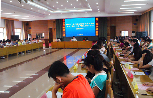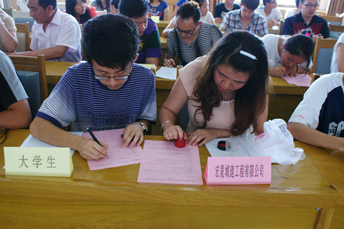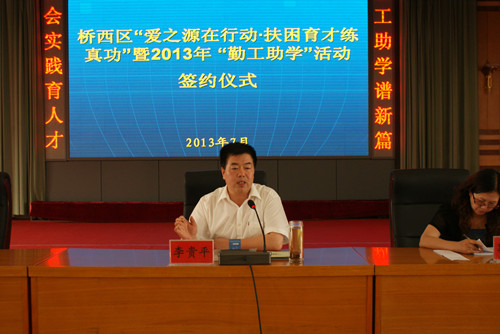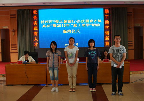 7月18日上午,桥西区总工会举行“爱之源在行动.扶困育才练真功”暨2013年“勤工助学”签约仪式。会上,桥西区112名大学生现场与企业签订了假期勤工合同,走上勤工助学岗位。桥西区80多家企业提供了涉及机关事业单位、机械加工、餐饮服务、办公文员、营销管理等127个勤工助学岗位供大学生们挑选。大学生联谊会会长程超、勤工实习学生代表刘正琨及爱心单位代表远大集团工会主席赵佳分别作了表态发言。区人大副主任、区总工会主席李贵平,出席会议并做了重要讲话。