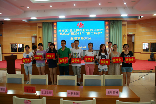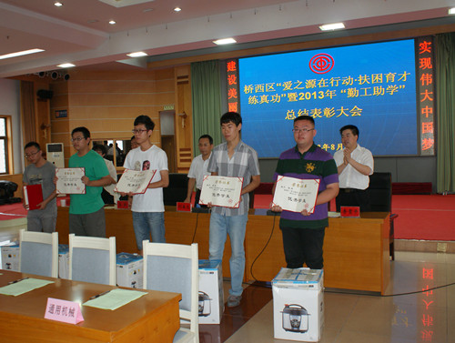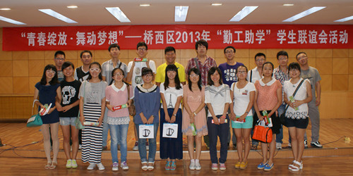 会上,集中观看了《桥西区“爱之源在行动·扶困育才练真功”——暨2013年“勤工助学”专题汇报片》为每位勤工助学大学生都留下了生动、形象的勤工岗位掠影;爱心单位现场向90名大学生发放了工资;区总工会对获得“勤工助学”活动优秀组织单位的张家口通用机械有限责任公司工会委员会等8家爱心单位和甄帅等5名勤工助学优秀大学生进行了表彰并颁奖了奖品电压力锅一个;通用机械、元强锻压、大唐机械、远大集团、中美电器5家爱心企业现场和学生签订了就业意向书;还为2013年金秋助学学生每人发放助学金3000元。之后,2013年勤工助学大学生联谊会组织全体学生在区机关二楼会议室召开了“青春绽放·舞动梦想”联谊活动。学生们通过抢凳子、你演我猜、托举乒乓球三个不同游戏,加强了沟通、增进了感情,区总工会还为每名学生准备了活动奖品和纪念品。