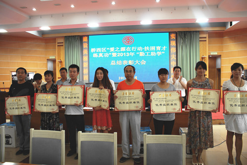 8月17日上午,桥西区“爱之源在行动·扶困育才练真功”暨2013年“勤工助学”活动总结表彰大会在区政府办公中心七楼会议室隆重举行,标志着2013年桥西区百名大学生暑期“勤工助学”活动画上了圆满的句号。出席大会的有市总工会党组书记、常务副主席闫奋生,市总工会经审办主任、职工服务中心主任马轩,区人大副主任、区总工会主席李贵平,各镇街总工会主席、常务副主席、工会专干、各直属工会常务副主席、爱心单位负责人及勤工助学学生共计200余人。会议由区总工会常务副主席武丽娜主持。