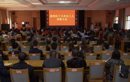 2014年4月29日,桥西区总工会举行了“十大杰出工人表彰大会”,区四套班子领导、市总领导(区委副书记王芳、区人大常委会主任李忠、区政协主席裴国忠、区委常委、政府副区长任桓、市总工会副主席周继文、区人大副主任、总工会主席李贵平)出席了表彰大会;十大杰出工人的单位领导作为特邀嘉宾也参加了大会;还有基层工会主席、常务副主席、工会专干和工人共计200人。