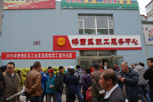 2015115日上午10点,桥西区总工会为全区在档管理的628名困难职工每人发放一包(9棵,约80斤左右)越冬大白菜。今天的活动设立一个主会场:区职工服务中心,为七街一镇及直属的企、事业单位300名困难职工发放越冬白菜;两个分会场即:工信局工会分会场,为工信系统176名困难职工发放越冬白菜;商务局工会分会场,为商务系统100余名困难职工发放越冬白菜。本次活动由桥西区总工会筹集1.5万资金,通过三方询价确定供货商,确保为困难职工发放质优价廉的白菜。对行动不便的困难职工要负责由工作人员送到家中。