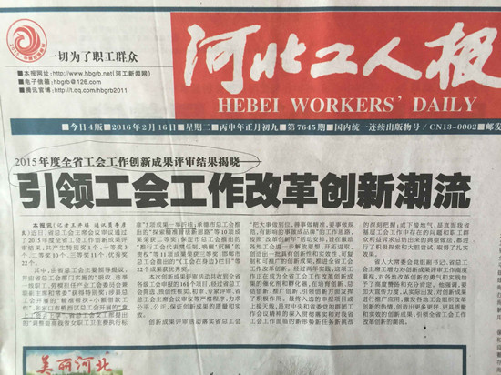2016年2月16日,河北工人报头版刊登出《引领工会工作改革创新潮流》一文,文章中特别提出了张家口市桥西区总工会开展"拿着工资去上学"的创新项目在2015年度全省工会工作创新成果评审结果中获得一等奖。