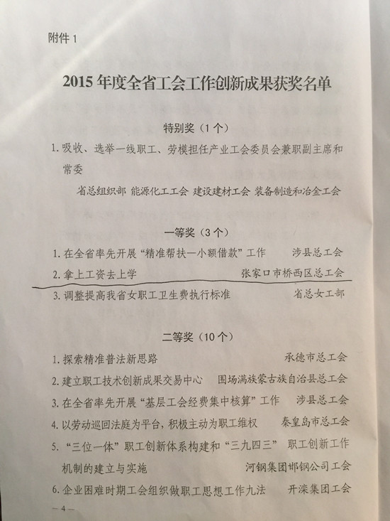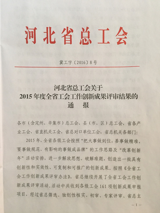 桥西区总工会荣获2015年度全省工会创新成果一等奖