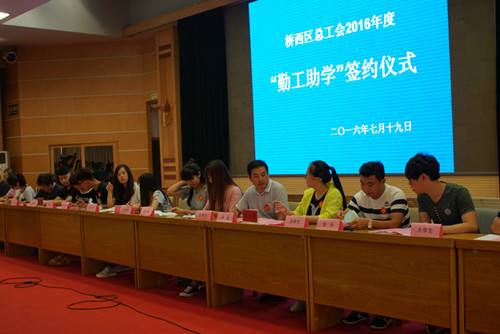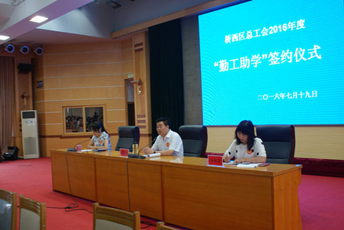 7月18日桥西区总工会“2016年勤工助学签约仪式”在区委办公大楼7楼会议室正式举行。