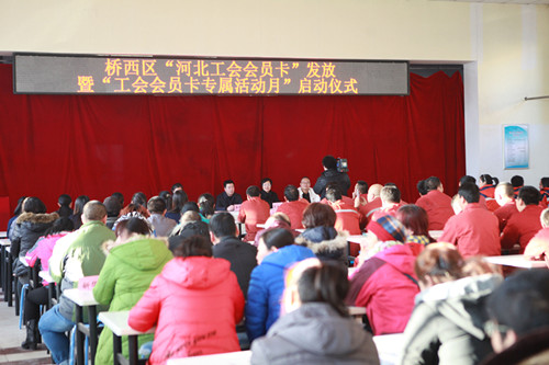 2016年12月2日下午桥西区总工会在斯必克冷却技术有限公司隆重举行“河北工会会员卡”发放暨“工会会员卡专属活动月”启动仪式。市总工会副主席高海林、市总工会办公室主任郑波、区人大副主任、总工会主席李贵平应邀到场并为职工会员代表、困难职工代表颁发工会会员卡。普惠活动签约商家华佗药房、卓冠商贸有限公司(酒快线)领导代表签约商家进行发言。各镇街、直属工会主席、常务副主席及工会专干、职工代表近300人参与活动。