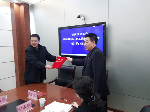 工会法律顾问、职工法律顾问将为我区职工群众提供法律宣传、法律咨询、法律调查以及其他法律援助服务,还将对工会干部进行法制培训,提高干部依法行政、依法维权的能力。会上市总工会副主席高海林在会上作了重要指示:职工法律援助是国家法律援助的重要组成部分,做好这项工作,需要各级工会、司法行政部门和律师工作者的紧密配合。在共同推进职工维权机制建设方面,双方要紧紧抓住劳动合同、集体合同和职代会三个关键,进一步建立健全工会维权机制,完善职工利益诉求表达机制、职工权益维护保障机制和工会维权协调机制。重点解决劳动合同与集体合同的签订和履行,社会保险费的缴纳、工资报酬的按时足额支付、劳动安全卫生条件的落实和改善等问题,指导和帮助企业建立健全劳动争议调解组织,把矛盾在第一时间化解在基层。 区人大常委会副主任、区总工会主席李贵平指出,这是桥西工运史上的一件大事,是维护劳动关系和谐和社会稳定,构建平安桥西的务实之举和创新之举。并就主动、依法、科学维权提出三点要求:(一)大力抓好法律宣传教育,提高职工法律意识和维权能力;(二)丰富法律顾问服务内涵,提高法律援助的实效;(三)着力指导合理、合法维权,进一步营造良好的用工环境。他同时要求受聘律师秉承职业操守,增强责任意识,尽快进入角色,把工会和职工的法律事务当作一项公益事业和爱心事业,想工会之所想,急职工之所急,为社会的和谐稳定作出贡献。