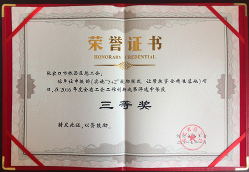 桥西区总工会《实施“5+2”救助模式 让帮扶资金精准落地》项目,在2016年度全省工会工作创新成果评选中荣获“三等奖”。