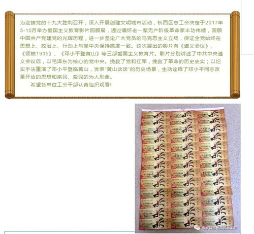 为扎实推进创建文明城市工作,鼓励全区各级工会及广大职工投身到全区精神文明创建活动中,根据市总工会创建工作推进会议精神及有关文件精神的要求,近日,桥西区总工会为推进文明城市创建工作,号召基层工会积极组建志愿者队伍,大力开展“争建文明班组、争创文明岗位、争当文明职工、提升职工职业道德素质”创建活动;同时,为基层单位购买160张电影票,组织工会观看爱国主义教育片,通过缅怀老一辈无产阶级革命家丰功伟绩,回顾中国共产党建党的光辉历程,进一步坚定广大党员的马克思主义立场,树立爱国主义情怀;并在全区工会微信公众号中,积极倡导知荣辱、讲正气、树新风、促和谐的文明风尚,团结带领广大职工迅速掀起创建工作热潮,扎实推进创建文明城市各项工作深入开展。