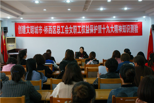 为深入学习贯彻党的十九大精神,推动女职工权益保护法律法规的学习和普及,切实提高女职工素质和保护女职工权益,桥西区总工会组织开展了创建文明城市·女职工权益保护十九大知识学习和测试活动。