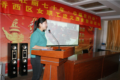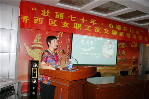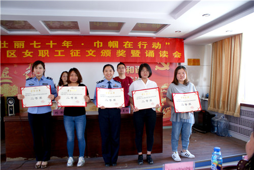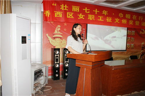 活动现场,为荣获女职工读书征文活动的优秀集体斯必高空气冷却技术(张家口)公司工会、教育局工会、明德南街街道总工会和获奖个人颁奖。颁奖仪式结束后,时代橡胶制品股份有限公司工会的李春华、明德南街街道总工会的张春娟等五位获奖代表登台进行作品诵读,区总工会常务副主席李晨炜同志作了讲话。