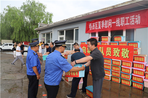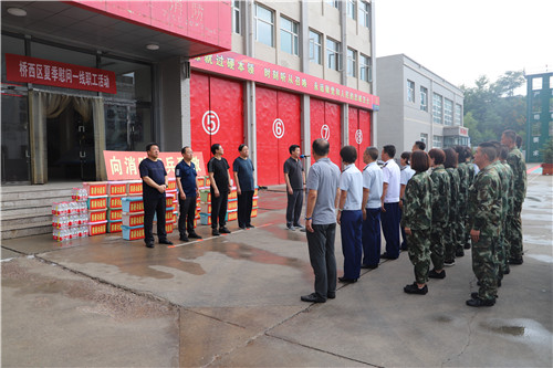 在高温酷暑的伏天期间,为保证广大职工的劳动安全和健康,确保各项工作的顺利进行,8月5日下午,桥西区委书记张照平、区人大常委会主任李忠、区政协主席裴国忠、区委常委、区委办主任高树国,区人大常委会副主任、区总工会主席李贵平代表区四套班子冒雨看望慰问了坚守在一线辛勤工作的职工们,开展“送清凉”活动,为一线职工送上党和政府的亲切关怀与问候,也送去了工会作为职工“娘家人”的一片深情。