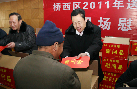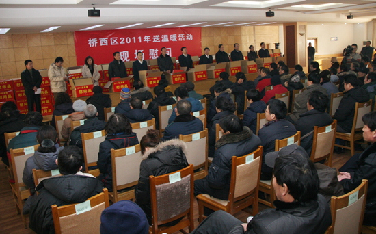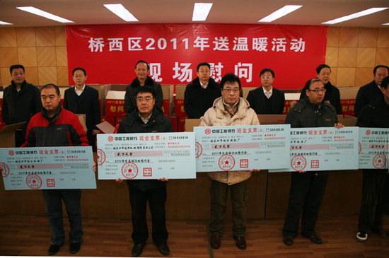 1月19日上午,为确保全区困难职工度一个欢乐祥和的春节,桥西区组织开展了“心系职工情、温暖进千家”困难职工集中慰问活动和困难企业救助金发放仪式。区委“四大班子”领导现场对200名困难职工和11家困难企业进行了慰问,每名困难职工喜领慰问品1份(包括2只精品兔、2只白条鸡、5斤鸡蛋、5斤猪肉、9种蔬菜、胡麻油、饺子醋、瓜子花生、春联等价值300元)和200元慰问金,并对11家困难企业给予20万元的企业救助金。
