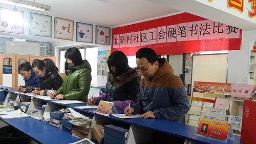 工人新村总工会联合各个社区单位与2014年11月29日举办了历时2天的硬笔书法比赛,本次比赛采用统一表格、统一内容、现场书写的办法,以“翰墨飘香,艺满泰峰”为书写主题,紧紧围绕基层干部作风建设学习,不断完善自我,提高文化素质,锤炼务实为民的干部作风,得到了全体社区工作人员、及辖区驻街代表的欢迎和积极参与。