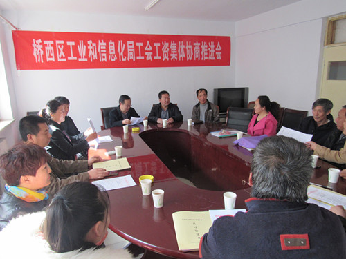 3月26日上午,桥西区工信局工会认真贯彻《河北省企业职工工资集体协商条例》精神和《桥西区2015年工资集体协商实施方案》的要求,在二楼会议室召开了工信系统行业性工资集体协商推进会。省工资集体协商指导员白海燕参加了会议,并对2015年工信系统行业性工资集体协商的工作进行了详细的指导。会上,局工会主席张志总结了2014年度全系统行业性工资集体协商工作的报告。并对2015年工作提出了总体要求和部署,要求从“把握当前形势,架构企业和职工协商通道;积极主动作为,确保完成目标任务;突出分类指导,推动协商深入发展;突出协商重点,提高协商质量;加强服务指导,提升协商能力;加强舆论宣传,强化履约监督检查,确保工资集体协商的工作有序推进。