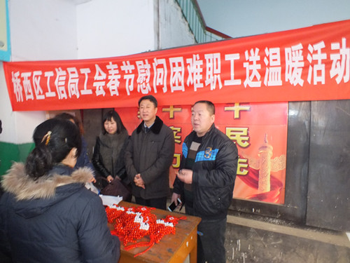 春节来临之际,为让困难职工过一个幸福、欢乐、祥和的节日,充分发挥基层工会帮扶救助作用,局工会对系统企业164户困难职工、精准特困职工家庭进行了集中慰问。桥西区总工会副主席白淑萍、帮扶中心副主任陈大伟参加了这次活动。本次慰问活动中每人发放300元帝达购物卡和补贴两季度困难职工购买米、面、油反还现金340元,以及一个手工编织水晶双鱼一对,共为发放人民币合计102240万余元。(王尤春)