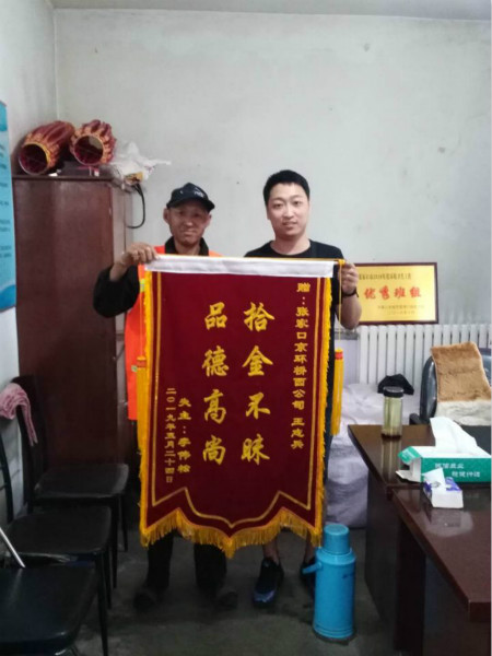 2019年5月23日晚上7:40左右,王志兵同志在张家口传染病医院附近捡垃圾时,无意中发现护栏边躺着一个黑色钱包,捡起来打开一看发现里面装有一叠百元大钞,还有身份证、银行卡等物件。正在工作时的王志兵又怕耽误工作,还怕失主前来寻找而不得,就在路边等了二十分钟,马上天黑了也不见有人来寻,情急之下他赶紧联系队长,希望赶快联系到失主。钱包交到队里,王志兵悬着的心也算松了一半,赶紧赶回到自己的工作岗位上,一边工作一边等待失主。队长拿到失物赶紧多方联系、打听,终于找到了失主,通过与失主进行信息核对后,将钱包物归原主,王志兵的心也彻底放松了下来。