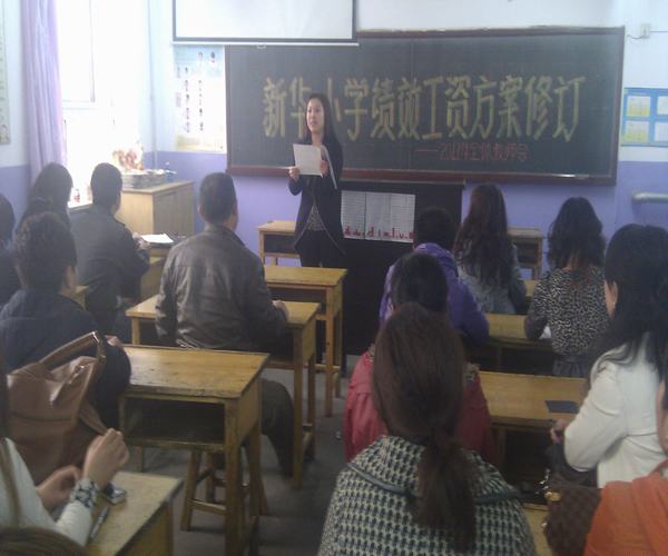 2011年4月29日下午,我校召开了全体教师会,针对去年绩效工资的实施情况进一步进行了修改和完善。