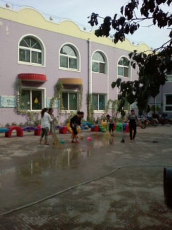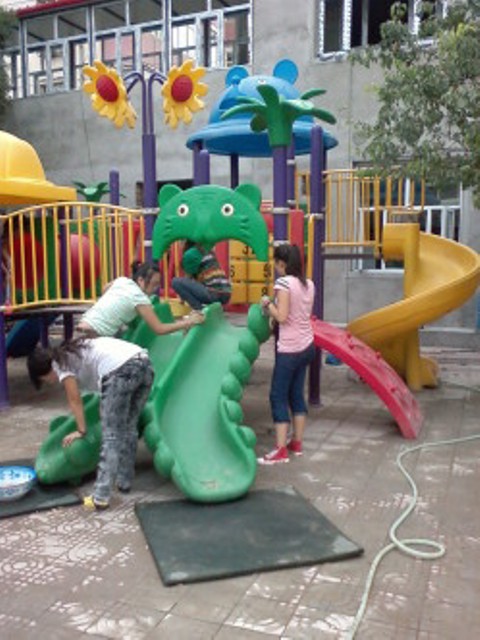 暑假期间,我园改建了幼儿食堂,校园的操场及大型玩具上有很多施工留下的泥土、水泥没有彻底的清理干净,幼儿园工会在各个工会小组中征求意见和建议,在教工中开展了“动手描绘清洁校园”活动,老师们各个争先恐后,想尽各种办法将操场和大型玩具上的泥土、水泥等清洗干净,让校园恢复了干净整洁。(杨文彬)