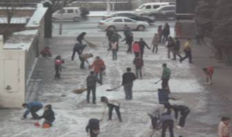 3月5日,2012年入春以来的第一场瑞雪突如其来的降临,在为美丽的校园增添了浓浓喜气的同时,也给师生的学习生活动带来了诸多不便。一大早,工会迅速组织老师和学生清扫教学楼等主要活动场所的积雪。在教学楼附近的主要道路上随处都能看到由老师和学生组成的一支支扫雪志愿者忙碌的身影,他们有的用铁锹铲,有的用扫帚扫,一点点清扫积雪,人人干得热火朝天。经过集中清扫,许多路面的积雪得到了及时清理,为师生营造了安全放心的出行环境。(毛孝艳)