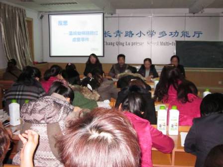 近日,浙江温岭城西街道蓝孔雀幼儿园教师颜艳红出于“一时好玩”,揪住一名幼童双耳向上提起的照片在网上引起热议。针对此事件,长青路小学党支部和工会联合召开全体教师座谈会。会上,韩鹏飞书记对颜艳红的所作所为做出了客观的评价,每一位教师也进行了发言,交流了自己对此事件的感受和想法,同时还纷纷表示,要以身作则,言传身教,以自己的实际行动感染学生,使学生自觉守纪,不用体罚或变相体罚,。杜绝颜艳红的事情发生在自己身上。最后,工会主席号召全体教师认真反思此事件。