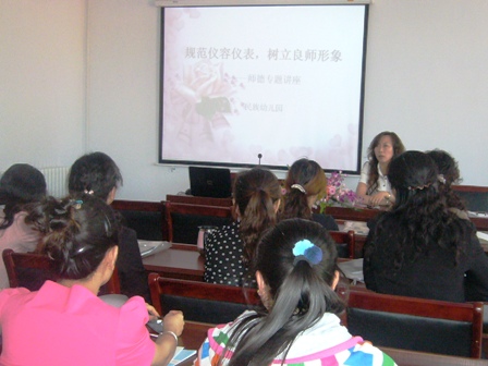 5月14日,民族幼儿园工会组织全体教师在二楼会议室开展了关于《规范仪容仪表,树立良师形象》师德讲座专题培训课。