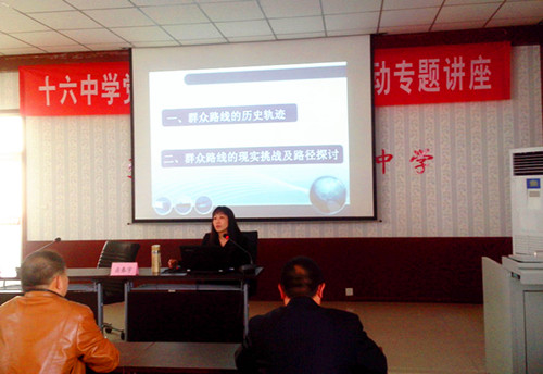 3月25日,第十六中学工会与校党支部共同邀请到张家口市党校岳春宇讲师,为全体教职工进行了《党的群众路线教育实践活动主题讲座》。岳老师以生动的事例、深入浅出的讲解,提高了全体教工对党的群众路线教育实践活动的认识、提升了思想意识和觉悟意识,为开展好学校党的群众路线教育实践活动奠定了坚实的群众基础。