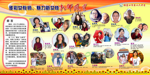 在三月的女维权月中,张家口市第十六中学由工会牵头,女工干部具体操作,开展了多项活动,在“多彩女教师,魅力新女性”风采展示活动中共收集整理了17名在教育教学中荣获市级以上荣誉的以及在其他方面有突出表现女教师,为她们制作了展牌,展示她们的所取得的成绩。通过展示,起到了学习先进,鼓舞干劲,凝聚力量的作用,促进了校园文化的发展。