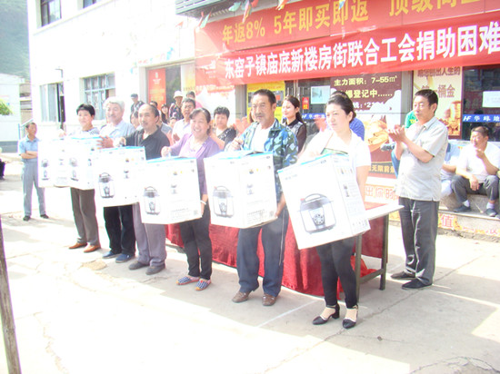 端午节来临之际,为体现桥西区总工会对新成立的东窑子镇庙底新楼房街联合工会困难职工的关心,30日上午,东窑子镇庙底新楼房街联合工会捐赠困难职工仪式在镇庙底新楼房街举行。区总工会为现场11名困难职工每人送上了价值300多元的电压力锅1台。区总工会常务副主席王昆出席捐赠仪式并讲话。区总工会副主席张春燕,东窑子镇总工会人大主席、工会主席石松参加了活动。