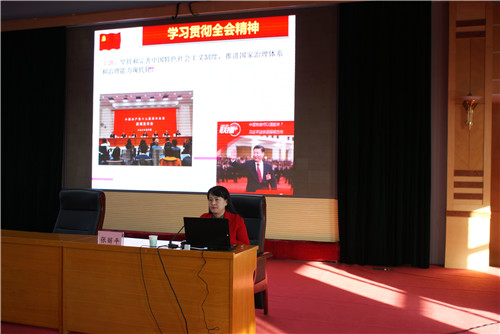 报告会上,张教授精准、全面介绍了十九届四中全会的重大意义、中特色社会主义制度和国家治理体系的显著优势,深入解读了十九届四中全会《决定》提出的总体要求、总体目标和重点任务,并结合当前开展的“不忘初心牢记使命”主题教育谈了认识体会。