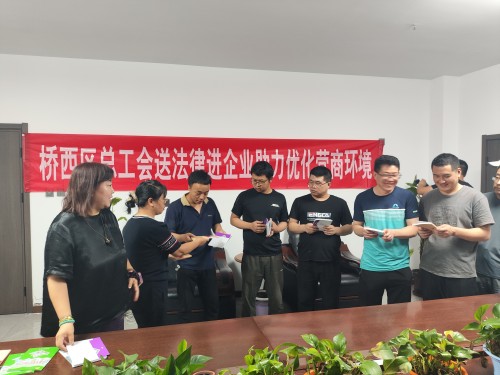 为增强企业职工的法治观念和法治意识,形成尊法学法守法用法的良好氛围,构建和谐劳动关系,促进社会和谐稳定,7月16日,桥西区总工会到巨源恒诚机电设备有限公司和杰星电子科技有限公司开展劳动领域法律宣讲活动。区总工会常务副主席胡海峰、副主席郝喜梅参加本次活动。