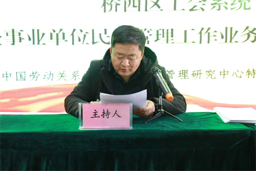 为了深入贯彻落实中央、省委、市委和区委关于健全企事业单位民主管理制度的部署要求,进一步提升我区工会干部民主管理工作的履职能力和业务水平,11月17日,桥西区总工会在金凤大厦成功举办2025年企事业单位民主管理工作业务知识培训会暨深入推进“一企一档”动态管理工作推进会。区总工会常务副主席胡海峰主持会议,中国劳动关系学院企业民主管理研究中心特聘教授司志通应邀作专题授课。区总工会班子成员、各部室负责人,以及来自教育、工信、商务系统和部分基层企事业单位的90余名代表参训。