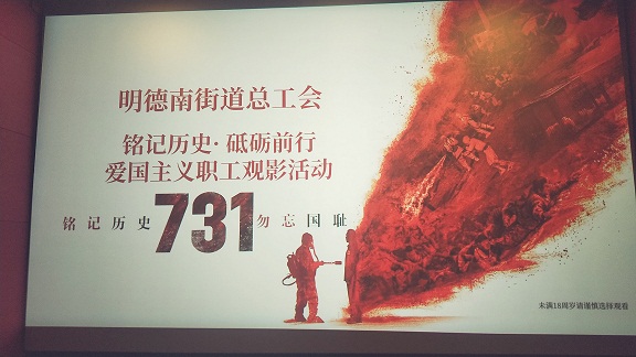 为引领广大党员、干部职工们重温抗战历史、铭记历史、缅怀革命历史、革命先烈,吸取奋进力量,深入推进党史学习教育,弘扬伟大爱国主义精神,激发干部职工们深厚的爱党爱国情怀。9月26日下午,明德南街道总工会组织开展《铭记历史砥砺前行》爱国主义职工观影活动,在中影百誉影城集中观看了爱国主义题材电影《731》。